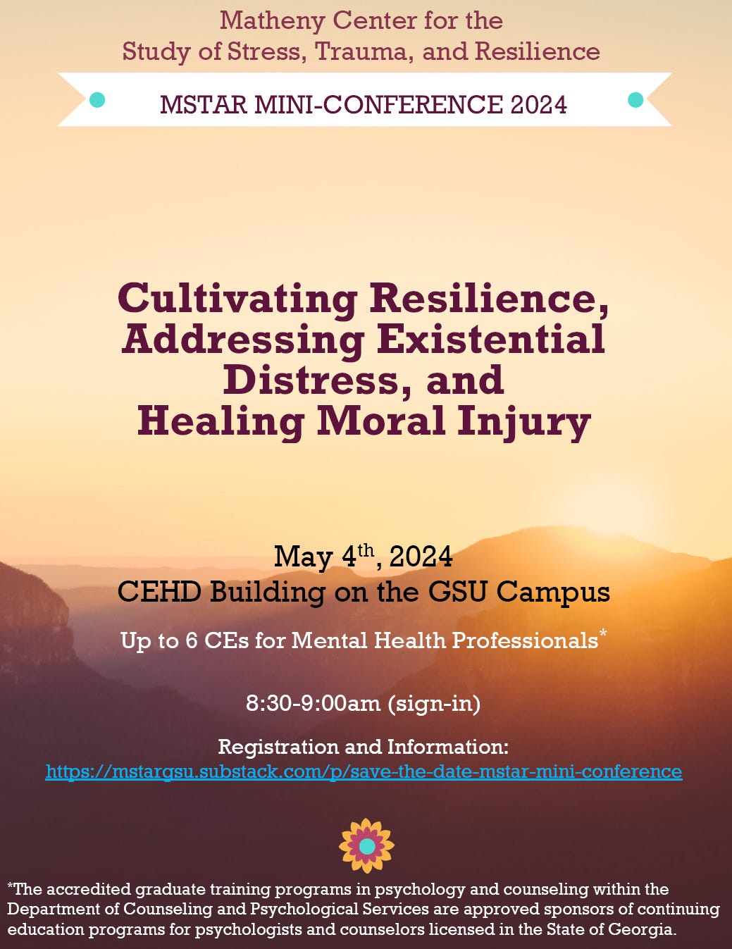 The Ken Matheny Center for the Study of Stress, Trauma, and Resilience (M-STAR) is hosting our second in a series of annual mini-conferences. The purpose of the series is to build relationships with research scholars at GSU and other universities, increase the national reputations of GSU and M-STAR, and build professional networks that will address important science-practice gaps. We especially want to prioritize the needs of early career researchers and clinicians.